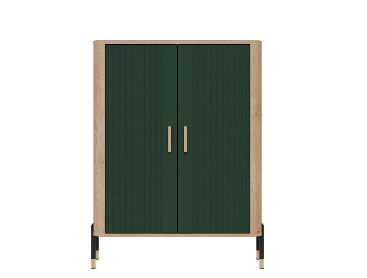 Korpus w kolorze Dąb Cremona Torro ociepla wnętrze i tworzy elegancką ramę dla frontów. Naturalny rysunek drewna wygląda szlachetnie, a przy tym ponadczasowo. Całość stoi na wysokich, czarnych nogach ze złotymi końcówkami. Bryła wydaje się lżejsza, a wnętrze nabiera oddechu.