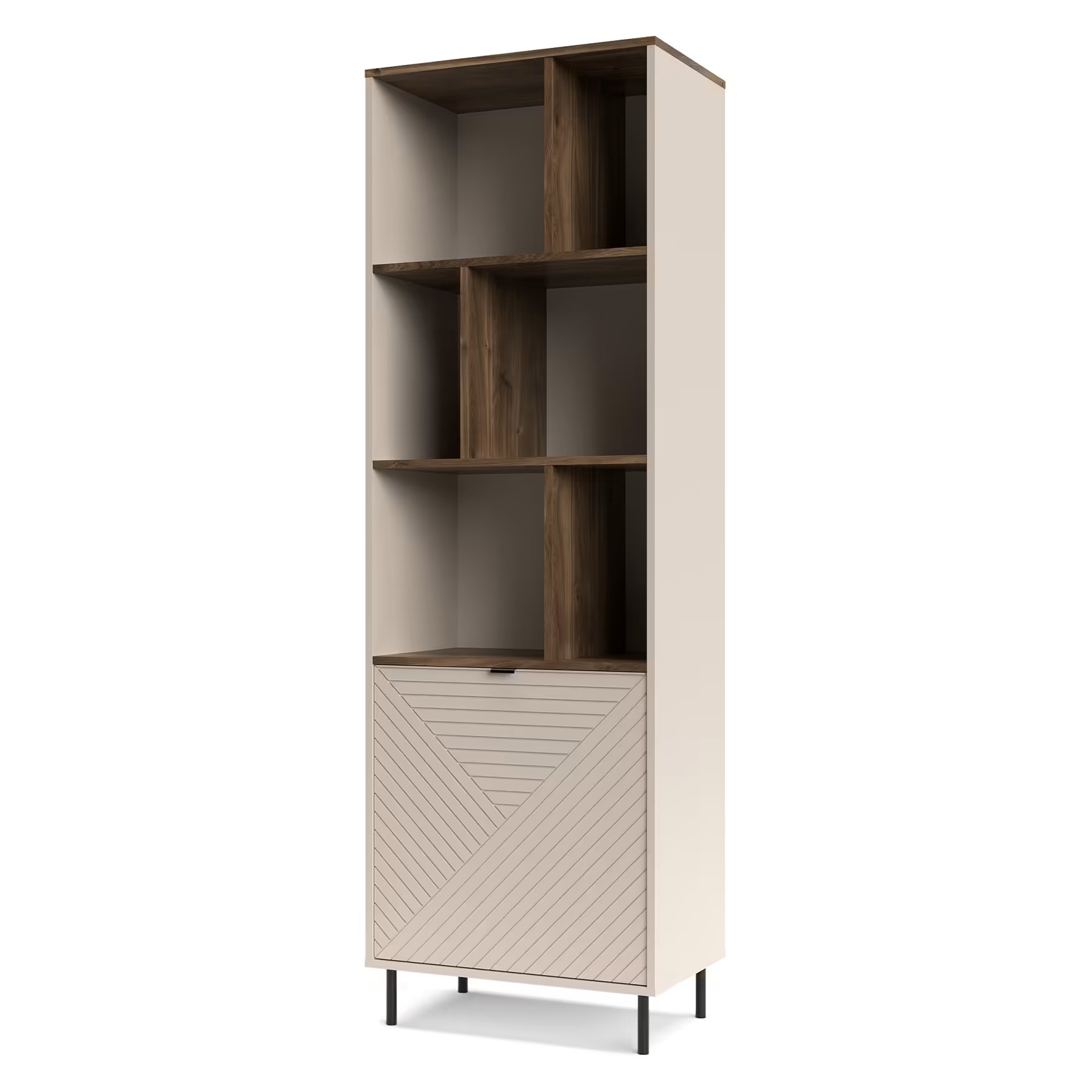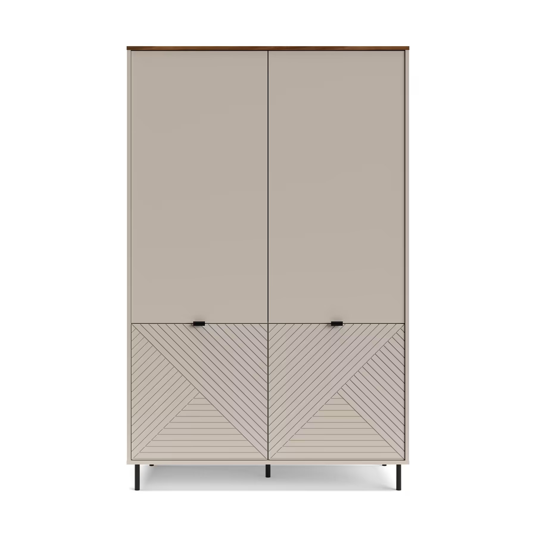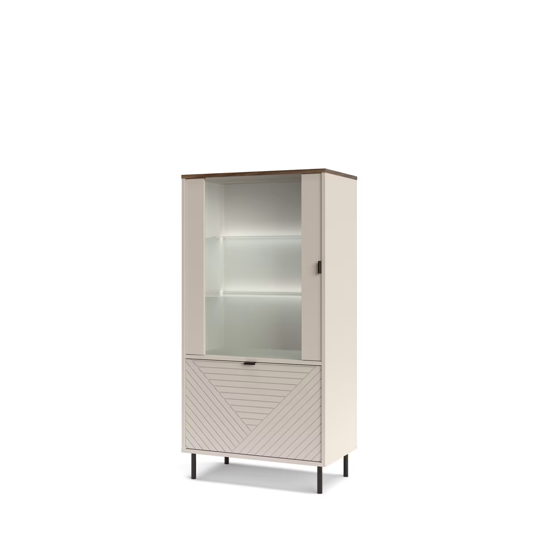Subtelne metalowe nóżki dodają meblom lekkości, a jednocześnie zapewniają stabilną konstrukcję. Delikatne, metalowe uchwyty zostały zaprojektowane tak, aby nie odwracały uwagi od frezowanych frontów — dzięki temu design pozostaje spójny i elegancki.