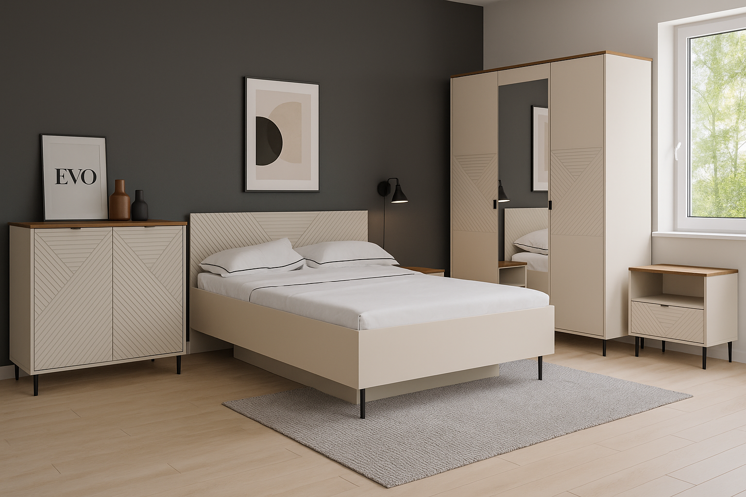 Kolekcja EVO została zaprojektowana tak, aby pięknie prezentować się w różnych przestrzeniach – od nowoczesnych salonów, przez eleganckie jadalnie, aż po funkcjonalne sypialnie. Geometryczne frezy, subtelne nóżki i kolor kaszmir tworzą spójny styl, który łatwo dopasować do neutralnych ścian, drewnianych podłóg czy dodatków w odcieniach złota i czerni.