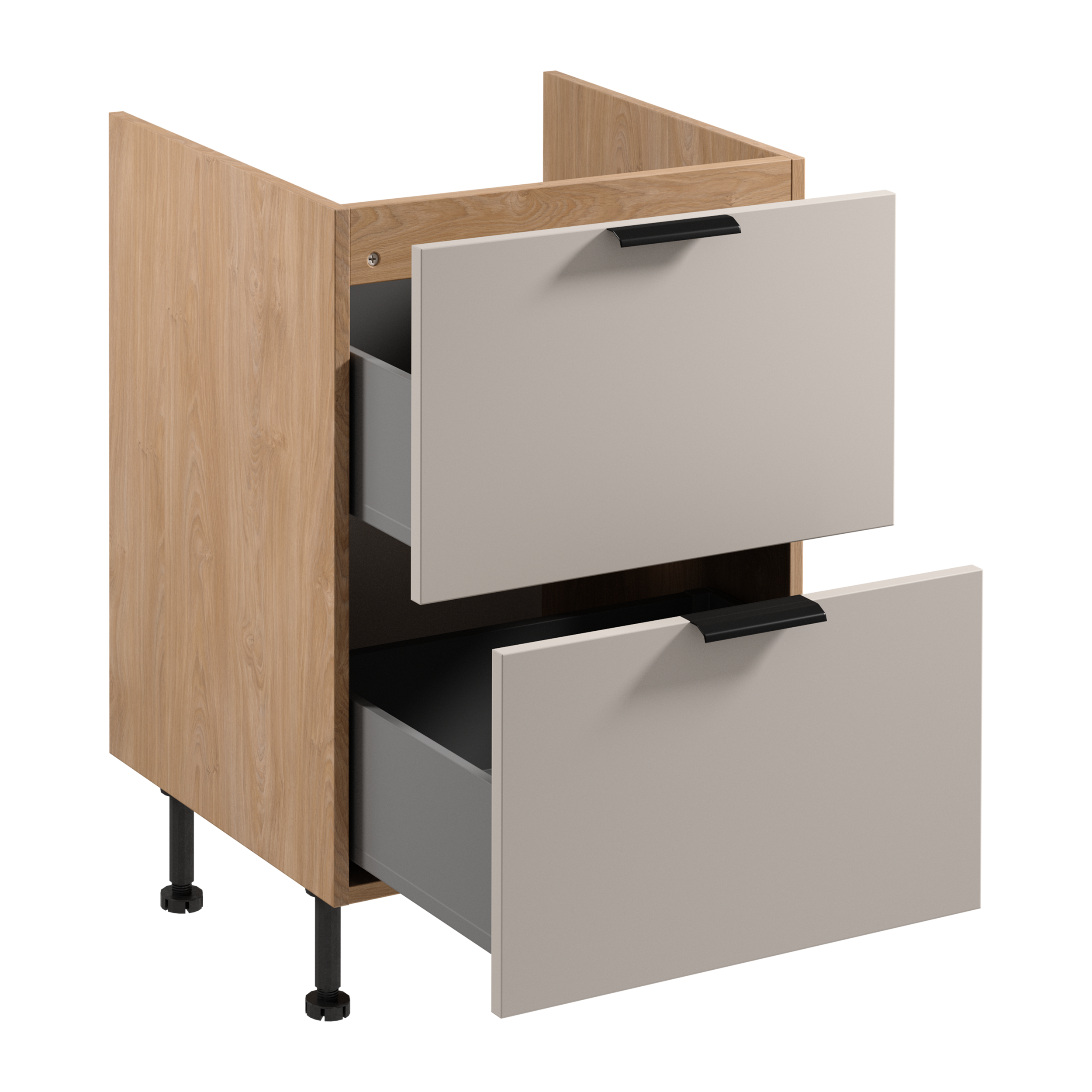 • Funkcjonalne rozwiązania – trzy pojemne szuflady z pełnym wysuwem i nośnością do 40 kg każda, a także regulowane nóżki (150-170 mm) pozwalają dostosować meble do nierówności podłogi.