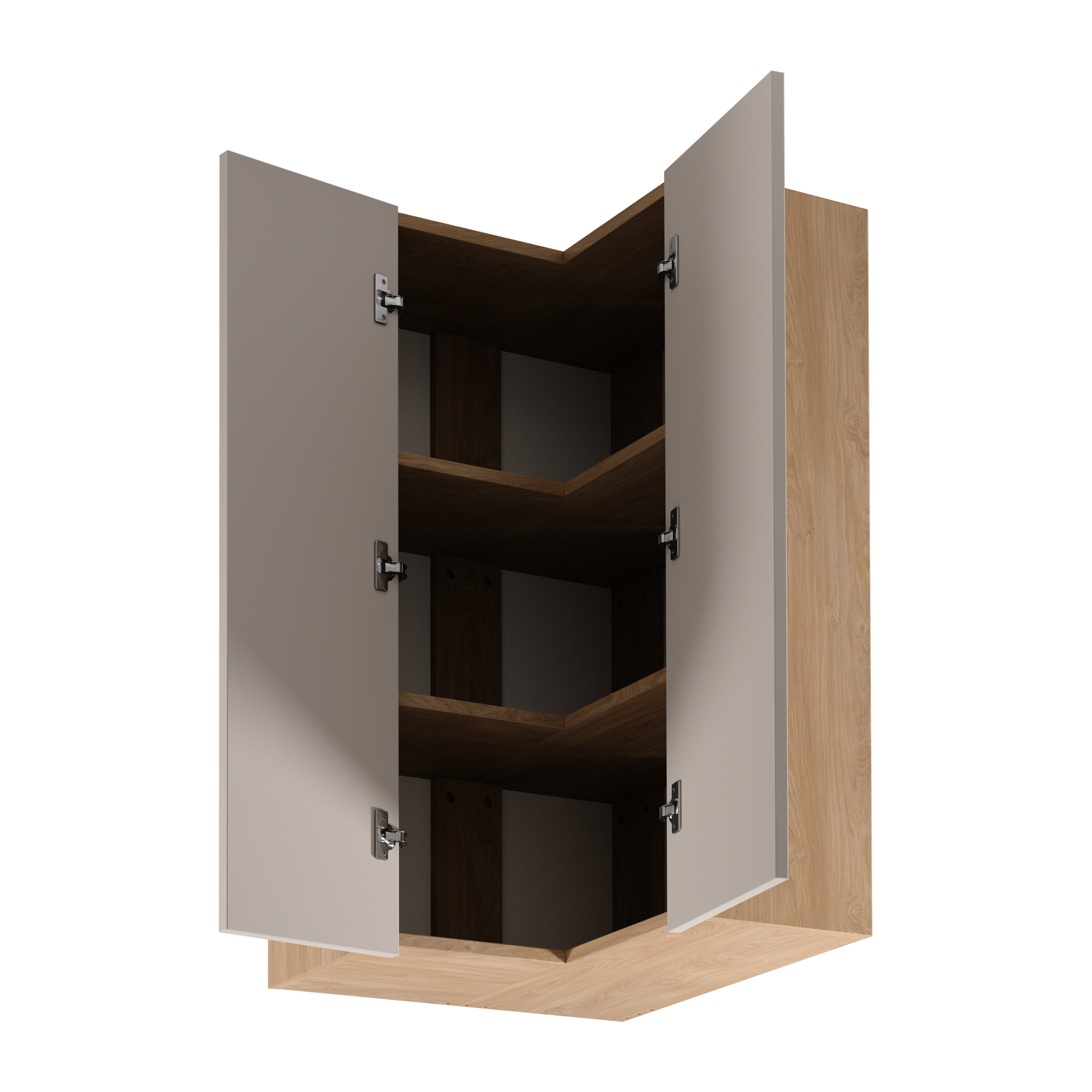 D90N. Szerokość 84 cm, głębokość 84 cm, wysokość 87cm W narożniku zamontowano podwójne drzwi dzięki którym uzyskano wygodny dostęp do wnętrza szafki.
