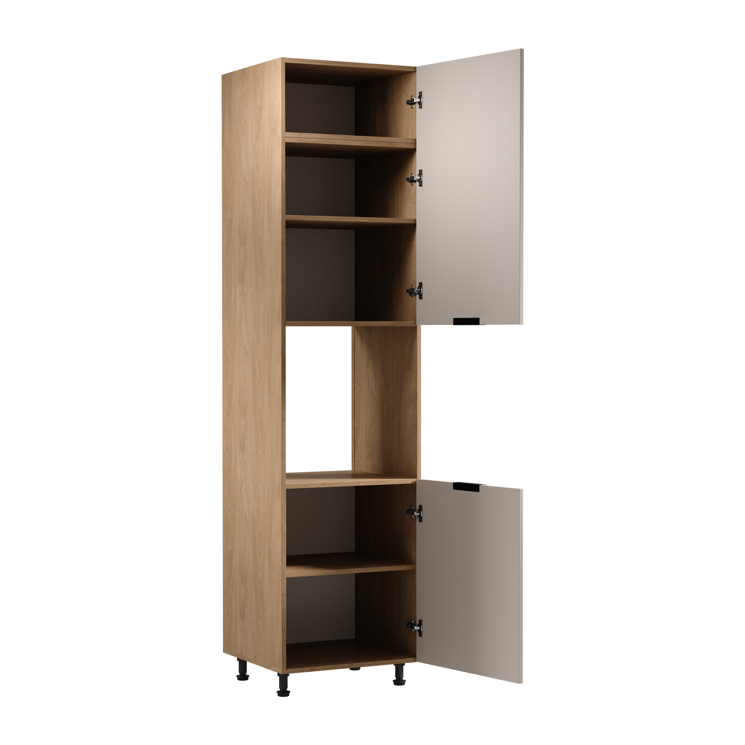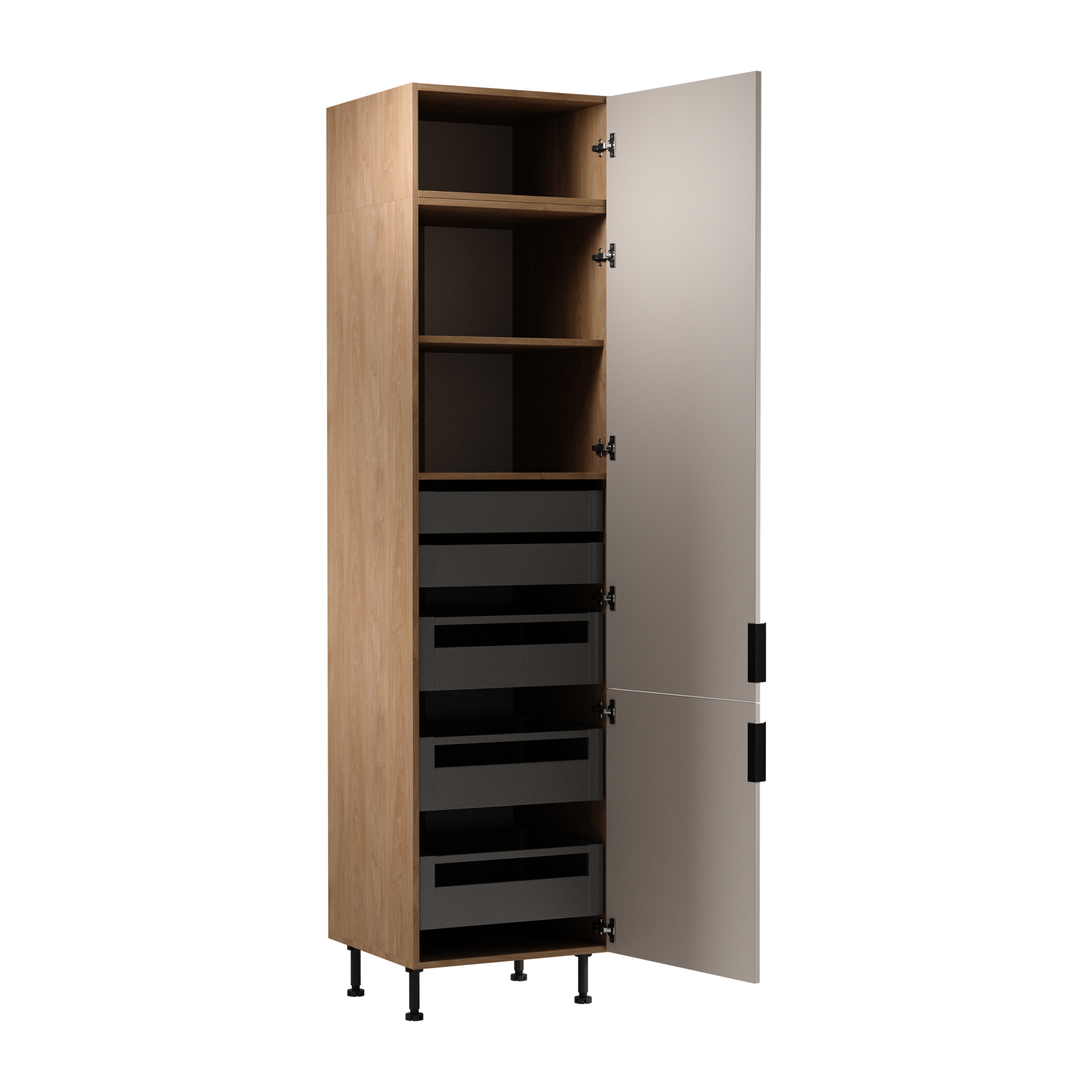 D60T o wymiarach jak poprzednio z tym, że oprócz 3 półek ma zamontowane 5 praktycznych szuflad. Ponad to zamontowane zawiasy umożliwiają szerokie otwarcie drzwi.