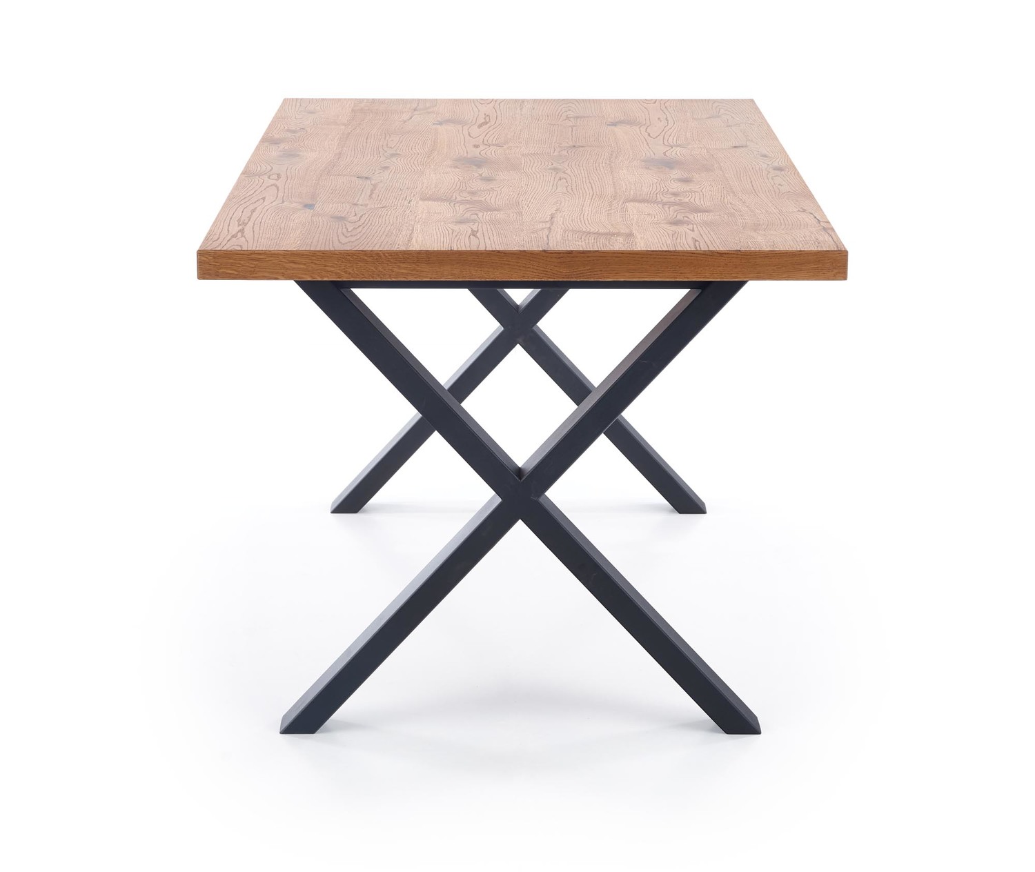 Blat stołu Xavier wykonany jest z płyty fornirowanej, która na obrzeżach zdobiona jest drewnem litego jasnego dębu. To połączenie materiałów najwyższej jakości, które nadaje stołowi niepowtarzalnego charakteru.