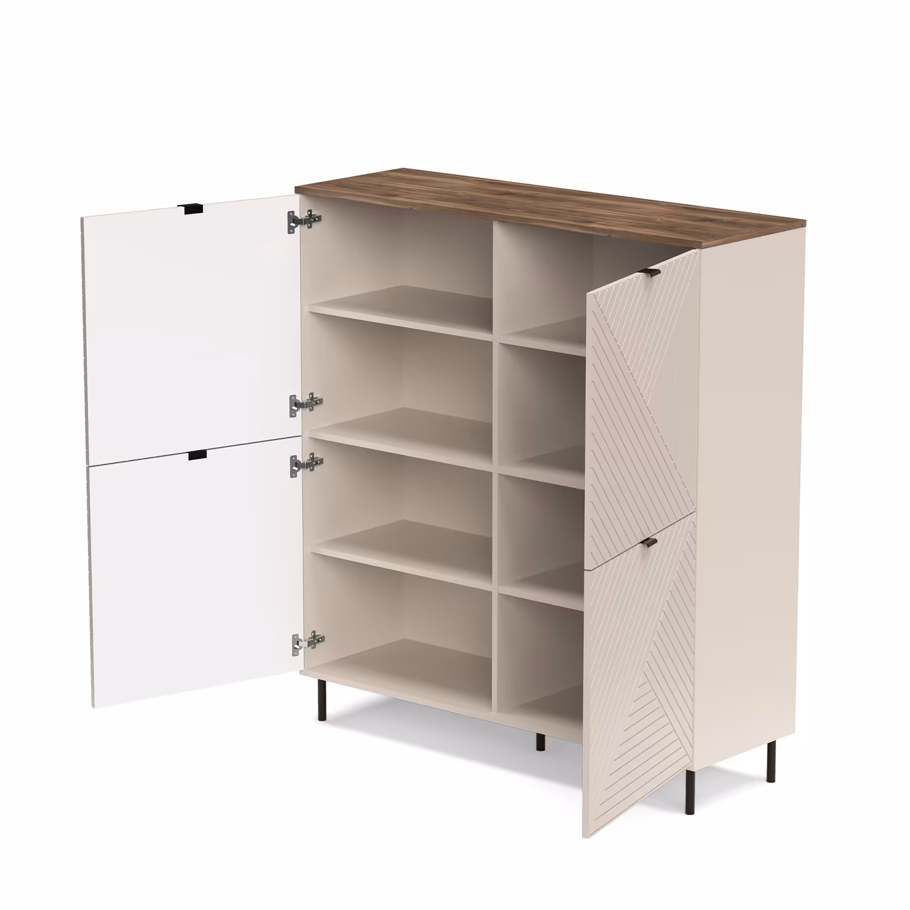 Za czterema drzwiami kryje się przestronne wnętrze, które pozwala uporządkować wiele domowych akcesoriów. Dzięki temu łatwo zadbasz o porządek, a wszystkie przedmioty pozostaną ukryte, lecz nadal łatwo dostępne. W środku zmieścisz dokumenty, tekstylia, dekoracje sezonowe oraz zastawę. Duża wysokość regału pozwala wykorzystać przestrzeń w pionie, a jednocześnie zachować lekkość całej konstrukcji. Metalowe nogi dodają nowoczesnego charakteru i ułatwiają sprzątanie pod meblem.